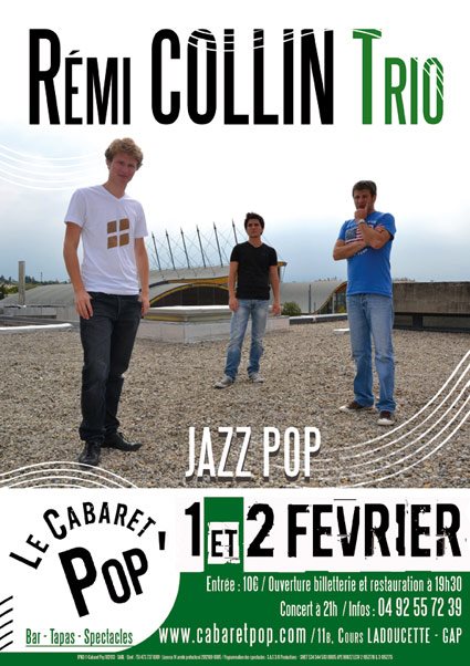 - 1er et 2 février – 21h : Rémi Collin Trio – Concert Jazz Pop – Billetterie et restauration à partir de 19h30 – Tarifs : 10€