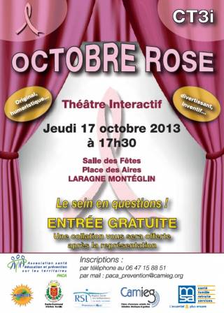 - 17h30 à 20h – Spectacle de théâtre interactif par CT3i, dans le cadre d’Octobre Rose, le mois international de mobilisation contre le cancer du sein – Salle des Fêtes – Entrée libre, tout public – Plus d’infos : 04 92 53 91 41
